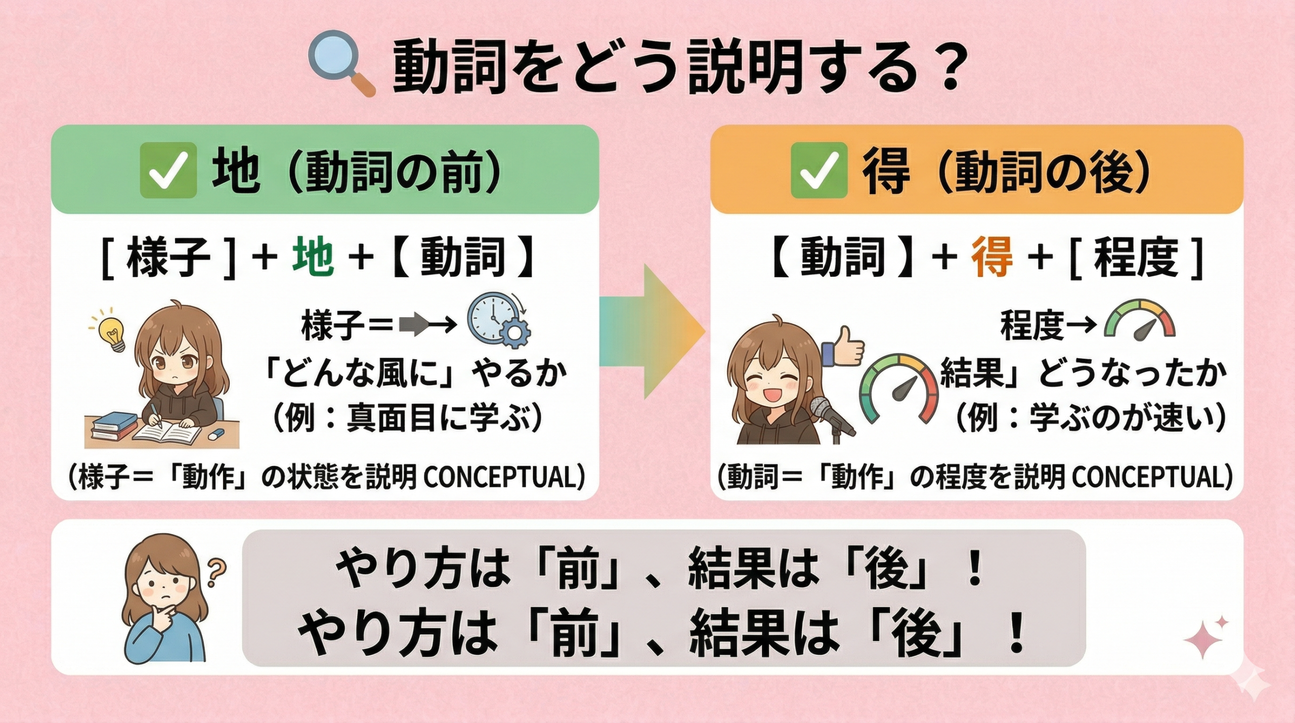- 地:動詞の「やり方」を説明する