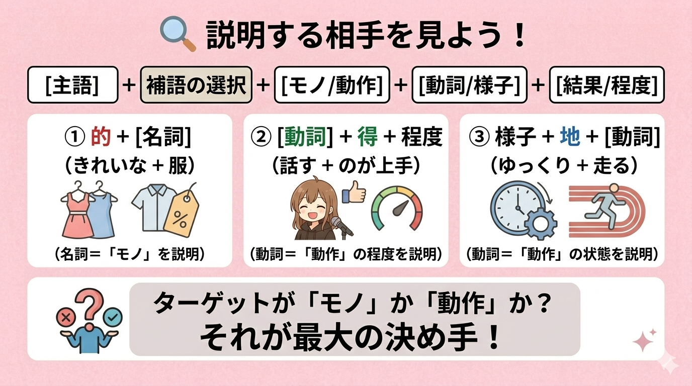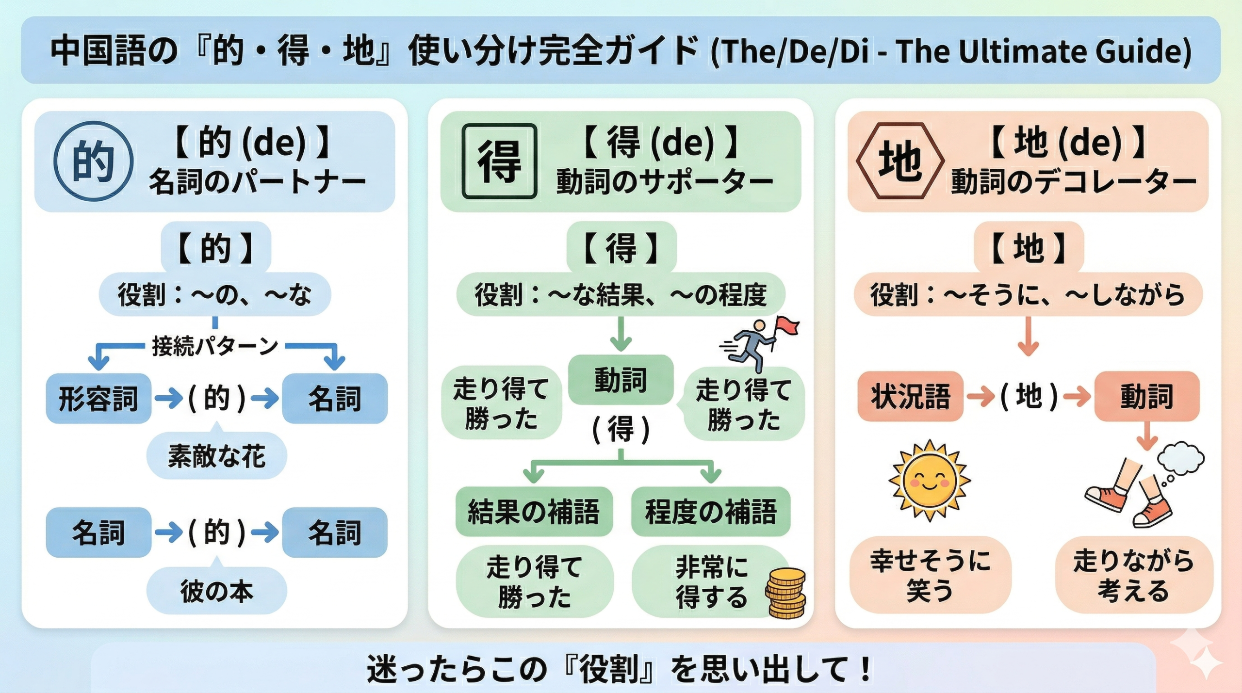 特に「得」と「地」を使い分けると、一気に「中国語ができる人」に見えます。